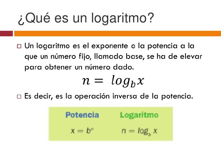 Un logaritmo expresa potenciacion, osea indica el exponente por el cual el exponente se debe elevar a la base para obtener la potencia que se desea. Logaritmo es el proceso para hallar el exponente a la cual fue elevada la base para obtener un numero.